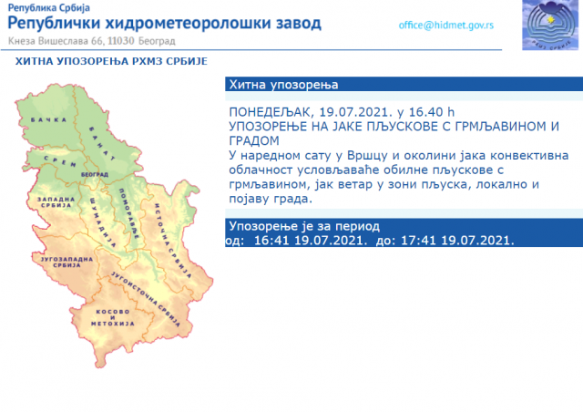 "U narednom satu u Vršcu i okolini jaka konvektivna oblačnost uslovljavaće obilne pljuskove s grmljavinom, jak vetar u zoni pljuska, lokalno i pojavu grada", navodi se u saopštenju.