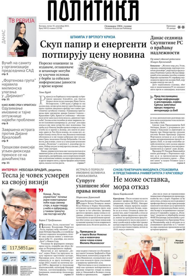 "Politika" piše o problemima s kojima se sureću štampane novine "Skup papir i energenti potpiruju cenu novina", a donosi i intervju sa rediteljem Nebojšom Bradićem "Tesla je čovek usmeren ka svojoj viziji".