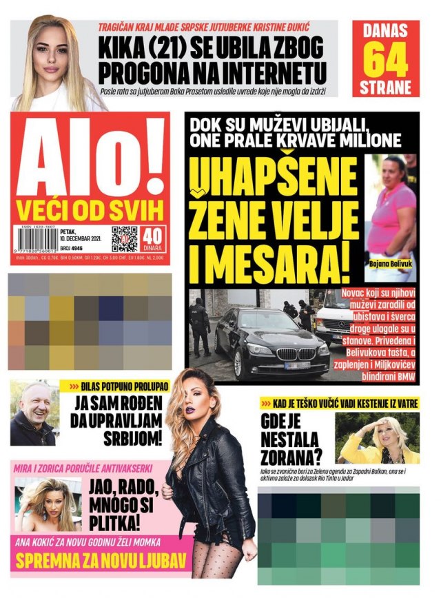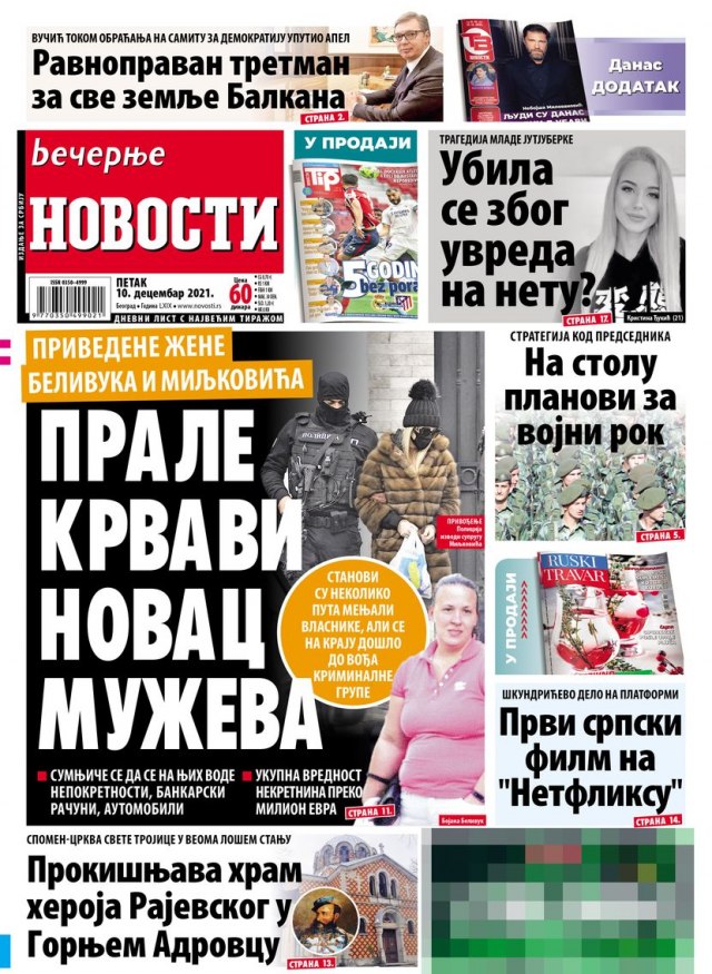 "Večernje novosti" pišu o hapšenju supruga Belivuka i Miljkovića "Prale krvavi novac muževa", a piše i o uspehu srpskog filma "Prvi srpski film na Netfliksu".
