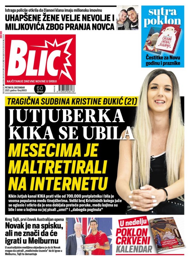 "Blic" piše o tragičnoj sudbini popularne Kristine Đukić "Jutjuberka Kika se ubila, mesecima je maltretirali na internetu", dok prenosi i izjavu prvog čoveka Australijan opena "Novak je na spisku, ali ne znači da će igrati u Melburnu".