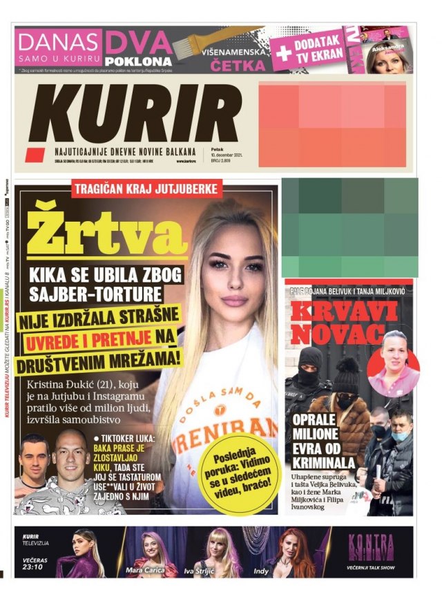 "Kurir" naslovnu stranu posvećuje tragediji mlade jutjuberke "Kika se ubila zbog sajber-torture".