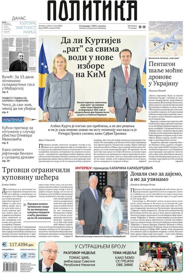 "Politika" je za centralnu temu odlučila da izabere Aljbina Kurtija i njegovu politiku: "Da li Kurtijev "rat" sa svima vodi u nove izbore na KiM".