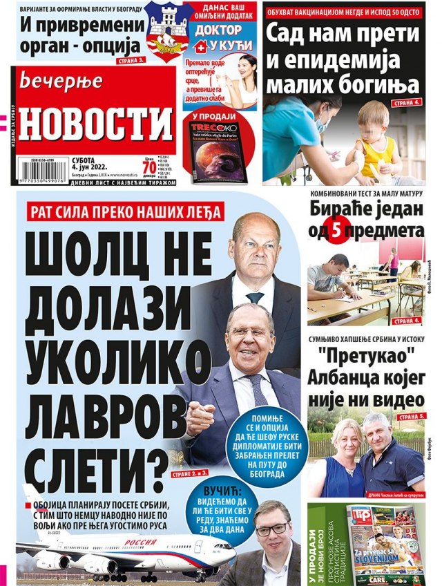 Dnevni list "Večernje novosti" je u fokus stavio dolazak ili nedolazak Šolca i Lavrova u Srbiju: "Šolc ne dolazi ukoliko Lavrov sleti?".
