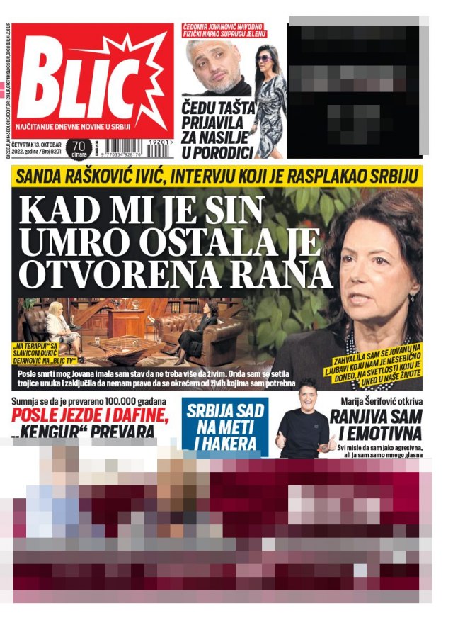 List "Blic" je na naslovnoj strani donosi intervju Sande Rašković Ivić: "Kad mi je sin umro ostala je otvorena rana".