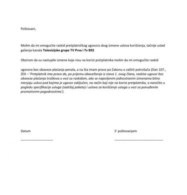 Važno je znati da korisnici imaju pravo da raskinu ugovor bez plaćanja penala, po Zakonu o zaštiti potrošača (član 170), ukoliko je kablovski operater ukinuo određenu uslugu ili promenio nešto iz opštih uslova potpisanog ugovora. U toj situaciji, građani imaju rok od 30 dana za raskid bez ikakvih dodatnih troškova, a potreban vam je papir sa pisanom molbom za raskid ugovora.