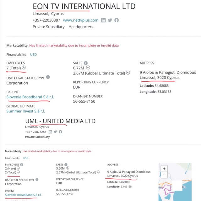 Kako navode, Šolakova firma pod nazivom Junajted Medija Ltd u Limasolu zove se skoro identično kao još dve njegove Junajted Medija kompanije iz Luksemburga i Ciriha, koje upravljaju nad N1 i Novom, a gde je "bankar Kremlja" Volfram Kuoni punih sedam godina bio predsednik.