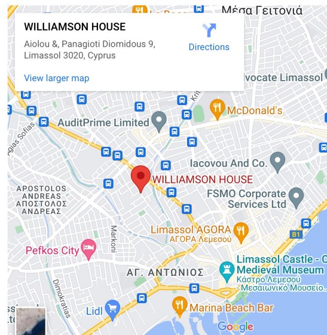 Poslovna zgrada se nalazi u naselju Katoliki u gradu Limasol, na južnoj obali Kipra, i poznata je kao "Williamson House".