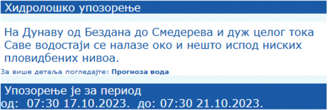 Prema upozorenju, na Dunavu od Bezdana do Smedereva i duž celog toka Save vodostaji se nalaze oko i nešto ispod niskih plovidbenih nivoa.