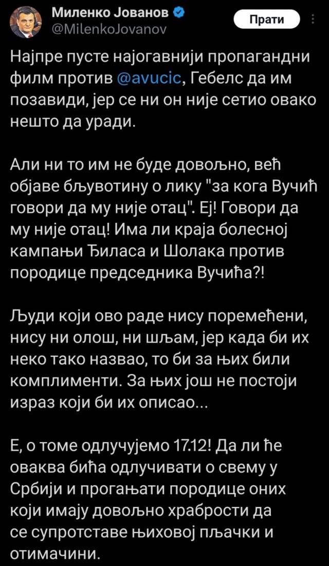 Ali ni to im ne bude dovoljno, već objave bljuvotinu o liku 'za koga Vučić tvrdi da mu nije otac'. Ej! Tvrdi da mu nije otac! Ima li kraja bolesnoj kampanji Đilasa i Šolaka protiv porodice predsednika Vučića?! Ljudi koji ovo rade nisu poremećeni, nisu ni ološ, ni šljam, jer kada bi ih neko tako nazvao, to bi za njih bili komplimenti. Za njih još ne postoji izraz koji bi ih opisao...