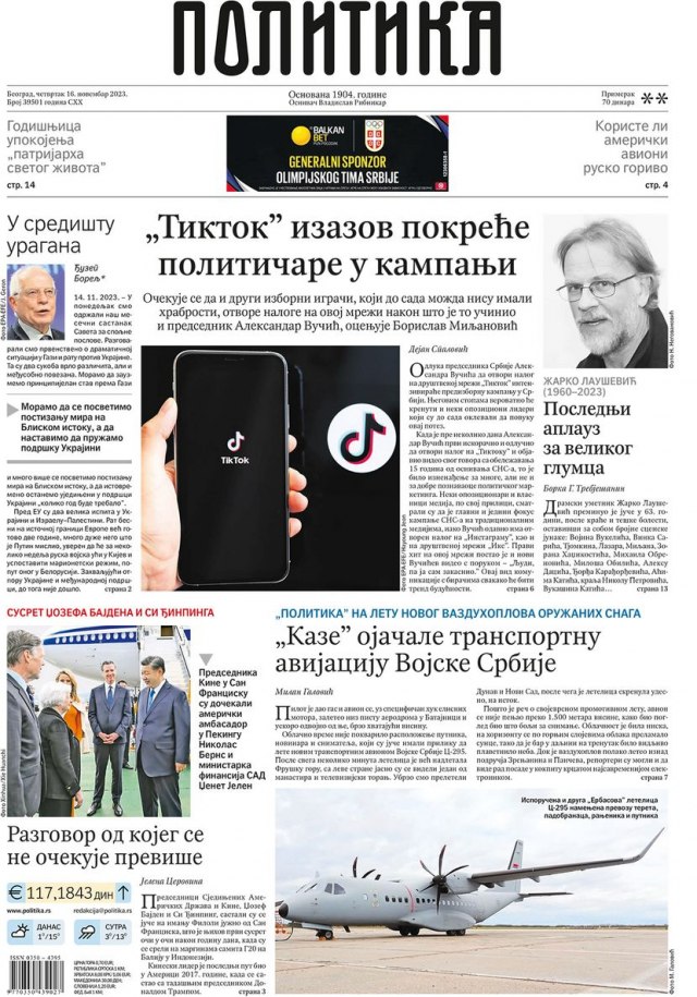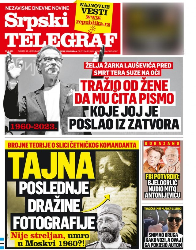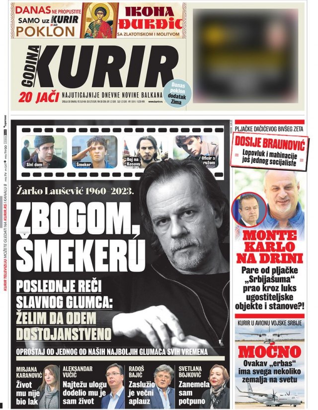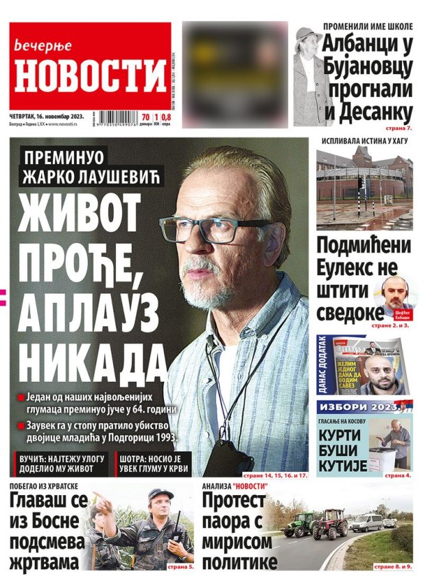 Dnevne novine u Srbiji za četvrtak, 16. novembar na naslovnim stranama se opraštaju od glumca Žarka Lauševića koji je preminuo u 63. godini.