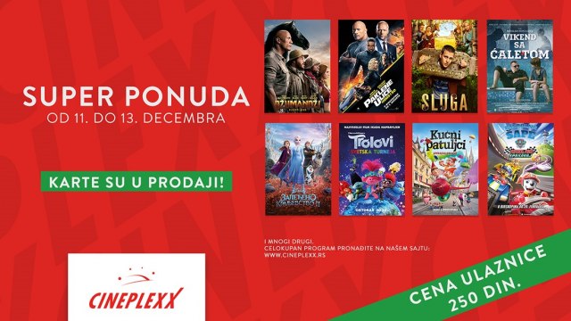 Da li ste znali da su Cineplexx bioskopi u okviru tržnih centara otvoreni ovog petka i vikenda?Ljubitelje sedme umetnosti od 11. do 13. decembraočekuje snižena cena ulaznica od 250 dinaraza sve filmove na repertoaru. Ali to nije sve! Najnoviji Cineplexx Galerija Belgradebioskop će raditi već od četvrtka, 10. decembra do nedelje 13. decembragde sve posetioce očekuje 1+1 akcija–uz već sniženu cenu ulaznica od 250 dinara, na jednu kupljenu ulaznicu druga se dobija gratis. Karte su u prodaji.