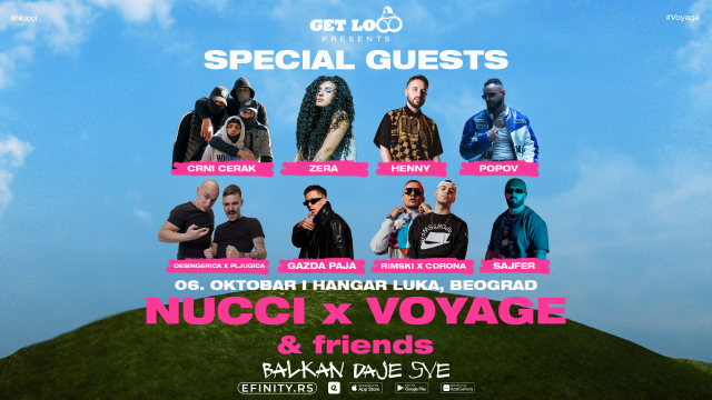 Zera, Crni Cerak & Lacku, Corona, Rimski, Popov, Henny, Desingerica x Pljugica, Gazda Paja i Sajfer, samo su neki od superzvezda novog muzičkog talasa koji će već najavljeni spektakl u PETAK 06. OKTOBRA u HANGARU Luke Beograd pod nazivom "Nucci x Voyage & friends: Balkan Daje Sve", pretvoriti u kultnu beogradsku priču i iskustvo koje će nadmašiti aktuelne okvire urbane muzike, ne samo prestonice, već čitavog regiona.