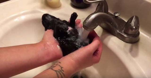 Sićušna maca po imenu Klaver tek uči kako da jede, pa često napravi nered. Pošto je sva umazana hranom, vlasnica je počela da je kupa u lavabou i otkrila da Klaver to obožava.