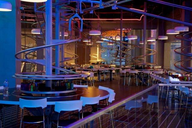 Kad se umorite od vožnji, možete da skoknete do tržnog centra Yas i u restoranu Rogo pojedete zanimljiv obrok koji će vam doslovno pasti s neba. U ovom restoranu se obroci dostavljaju preko šina koje i same izgledaju kao rolerkosteri, a porudžbinu birate preko tableta.