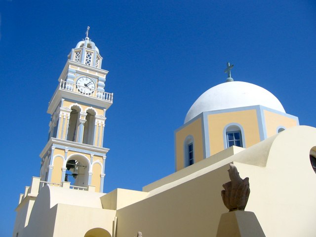 Ono po čemu je ovaj gradić najpoznatiji, jeste nestvarna belina njegovih jednostavnih kuća i arhitektura crkava - belo-plavih - pravoslavnih, ili onih sa okerastim detaljima - katoličkih. Na Santoriniju postoji katolička zajednica nastala u doba mletačke okupacije. Najstarije kuće datiraju s kraja XVII veka.