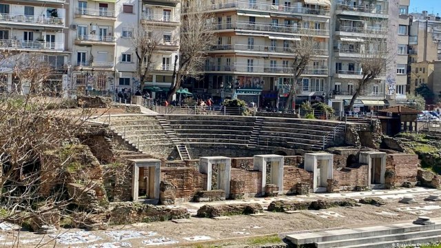 Ponovo iz svega toga šapuću vekovi. Lepo je videti pune bašte kafića. Pored Rotonde je još uvek minaret sa odrubljenim šiljkom. Vraćamo se prema centru popevši se iznad Rotonde na jednu od paralelnih ulica – Olimpu. Solun živi na tim ulicama kao na terasama više nego na samoj obali. I kao da je usmeren naviše, prema brežuljcima iznad grada. Nailazimo na rimski Forum sa amfiteatrom. To je najznačajnija arheološka lokacija u gradu. Našli smo mesto u bašti kafića The Blues Bar, na trotoaru iznad Foruma. Tih dana sam pio uglavnom vino. Ali ovaj put sam sebi priuštio irsko crno pivo. Bio je 17. mart, irski nacionalni praznik – Dan Svetog Patrika. I moj šezdeseti rođendan.