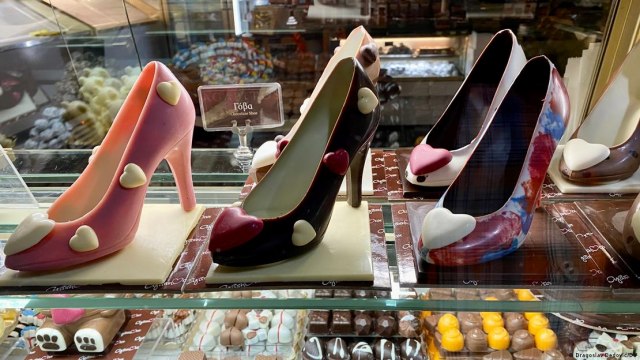 Krenuli smo dalje ponekad zastajkujući pred izlozima. U Solunu ima svega – od dalekoistočnog treša do skupih firmiranih stvari. Posebno nas je privukao izlog konditorske radnje u kojem su bile izložene – cipele od čokolade.