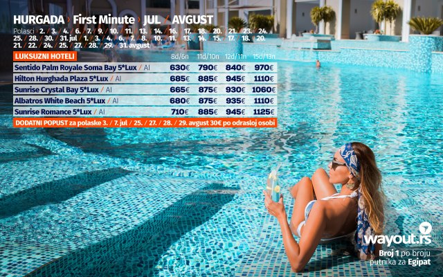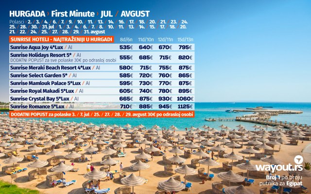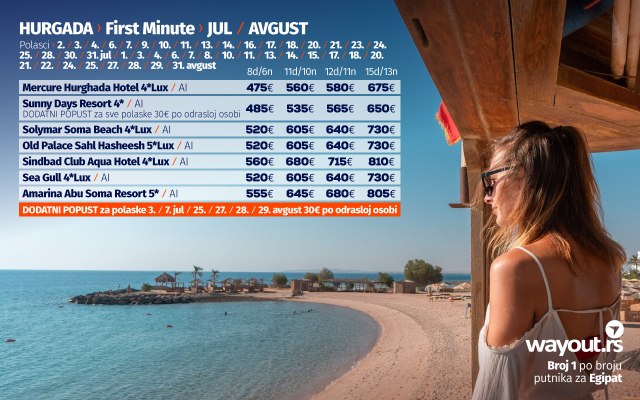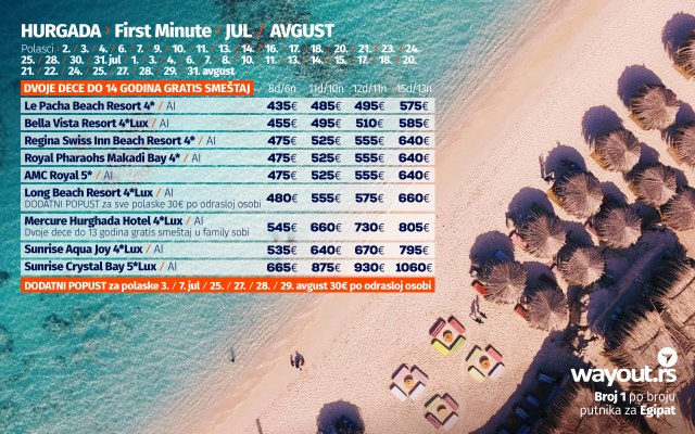 U saradnji sa najpopularnijim i najkvalitetnijim hotelima u Hurgadi i u uz veliku zahvalnost nacionalnoj avio kompaniji Air Serbia i avio kompaniji Air Cairo, obezbedili smo kapacitete za sve Wayout putnike koji budu želeli da svoj odmor ovog leta provedu u Hurgadi, a preporučujemo svima koji do sada nisu rezervisali svoje letovanje to odmah učine do 31. maja do kada traju poslednji first minute popusti i od kada se očekuju poskupljenja hotela zbog ogromne zainteresovanosti putnika iz cele Evrope.