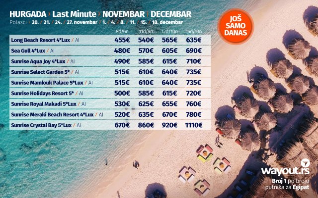 Pošto leto u Hurgadi traje tokom cele godine, za sve putnike smo spremili totalnu rasprodaju aranžmana za najsigurnije jesenje putovanje, a koja obuhvata Last minute ponudu za polaske u novembru i decembru, kao i First Minute ponudu za polaske u januaru, februaru i martu sa najpovoljnijim cenama aranžmana do sada i sa najvećim izborom hotela na tržištu. Obzirom na to da će Hurgada i u narednim mesecima biti jedna od glavnih svetskih turističkih destinacija, svima preporučujemo da se što pre odluče za željeni termin i željeni hotel, kako bi svoj aranžman bukirali pre putnika iz ostalih evropskih zemalja kao što su Nemačka, Rumunija, Češka, Poljska, Ukrajina, Rusija, a sve to za samo 199eur po rezervaciji, dok je ostatak aranzmana potrebno isplatiti 15 dana pre putovanja...