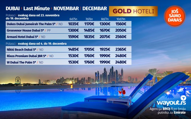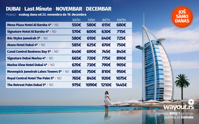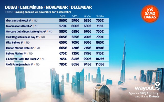 Wayout agencija, kao turoperator br. 1 po broju putnika za Dubai, uvek se trudi da svojim putnicima ponudi samo najbolje od najboljeg, a u skladu sa tim, naša last minute ponuda za novembar, kao i specijalna ponuda za polaske u decembru obiluju sjajnim ponudama sa najtraženijim hotelima, po najpovoljnijim cenama.