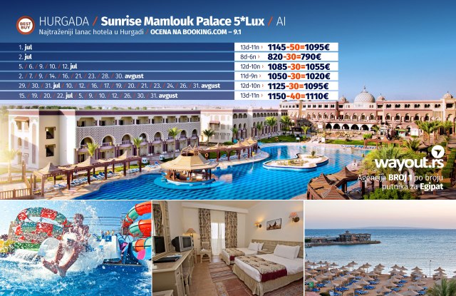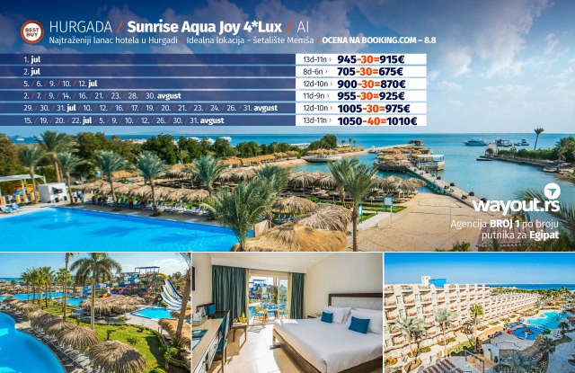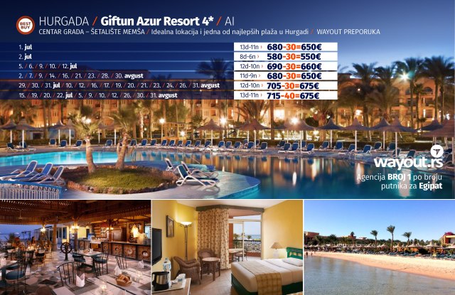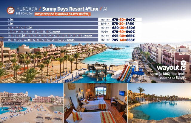 Naravno, period u julu i avgustu je najfrekventniji kada su u pitanju godišnji odmori, a za sve naše putnike, u saradnji sa najpopularnijim hotelima na našem tržištu, a definitivno je Hurgada porodično letovalište i kada se ceo trošak sabere, uzimajući u obzir nadaleko poznati All Inclusive koncept, ova destinacija je najisplativija, a Wayout agencija je ekskluzivno za svoje putnike obezbedila gratis smeštaj za dvoje dece do 14 godina u hotelima Sunny Days Resort, New Eagles Aqua Park, Long Beach Resort, Bella Vista, La Rosa Waves, AMC Royal i Tia Makadi Heights.