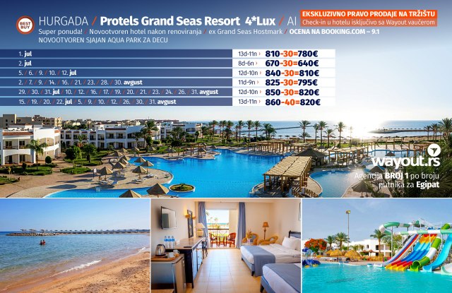 Takodje bismo posebno izdvojili tek renovirani i rebrendirani hotel za koji Wayout agencija ima ekskluzivno pravo prodaje za ceo region Protels Grand Seas Resort sa jednom od najlepših i najdužih plaža u Hurgadi, kao i neke od najpopularnijih hotela na našem tržištu kao što Sea Gull, ili neki od čuvenih hotela iz Sunrise lanca hotela kao što su Sunrise Aqua Joy koji je prilagođen porodicama sa decom na samom šetalištu Memša, a na kraju bismo izdvojili i jedan od najboljih hotela u Hurgadi sa po mnogim mišljenjima najlepšom plažom u Hurgadi - Sunrise Romance. Hurgada i Egipat nisu samo letovanje i kupanje u moru, već i fantastična all inclusive usluga, bogat noćni život, sunčanje tokom celog odmora, sjajni hotelski aqua parkovi za decu i bazeni koji se greju u toku zimskih meseci, odlasci na nezaboravne izlete u Luksor, Kairo, pustinjski Safari i još mnogo, mnogo toga, a uz potvrdu o vakcinaciji ili uz negativan antigenski ili PCR test, na svoje putovanje u Hurgadu možete otputovati bez stresa i dodatnih troškova.