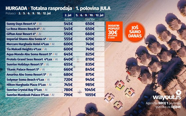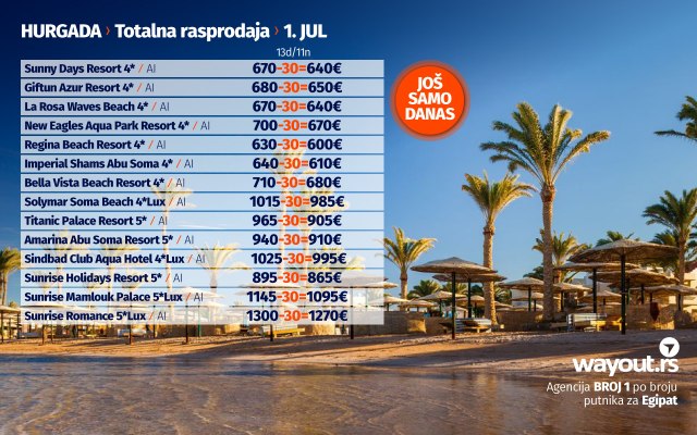 Pravo leto u Hurgadi počinje u julu, a zbog veoma velikog interesovanja, Wayout agencija je obezbedila dodatne kapacitete u najtraženijim hotelima i u avionima, a posebno izdvajamo neodoljivu Totalnu rasprodaju aranžmana za polazak 01. jula gde možete kupiti aranžman u trajanju od 11 noćenja po ceni 9 noćenja, zatim još jednu Totalnu rasprodaju za period putovanja u toku 1. polovine jula, kao i Letnju šok akciju za putovanja u drugoj polovini jula i u avgustu.