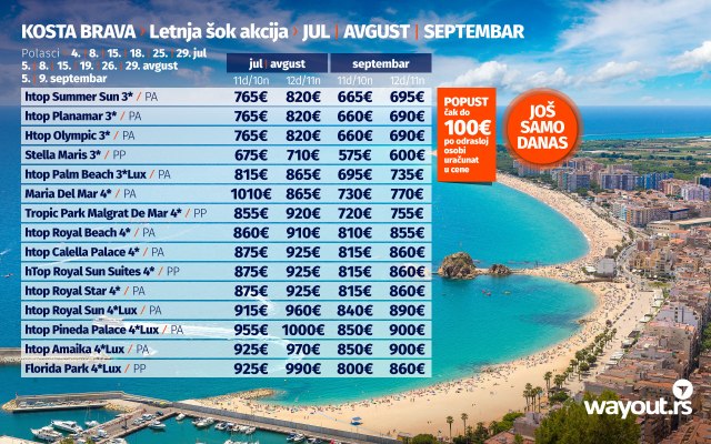 Ako ste mislili da Kosta Bravu možete posetiti samo autobusom, ovog leta smo odlučili da promenimo to mišljenje i svojim putnicima priredimo novo iznenađenje i u ponudu uključimo paket aranžmane avionom za Kosta Bravu sa neodoljivim i povoljnim ponudama za ovaj deo španske obale u blizini Barselone. Ova fantastična ponuda obuhvata polaske od sredine juna, pa sve do sredine septembra, a za sve naše putnike smo pažljivo izabrali hotele koji odgovaraju raznovrsnim ukusima i zahtevima putnika. Upoznajte lepote Kosta Brave i Barselone uz maksimalan komfor dobro poznatih hotel i uz minimalno utrošenog vremena u putovanju.