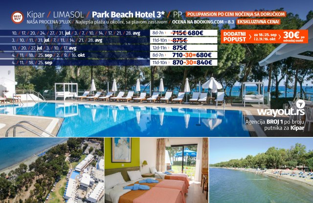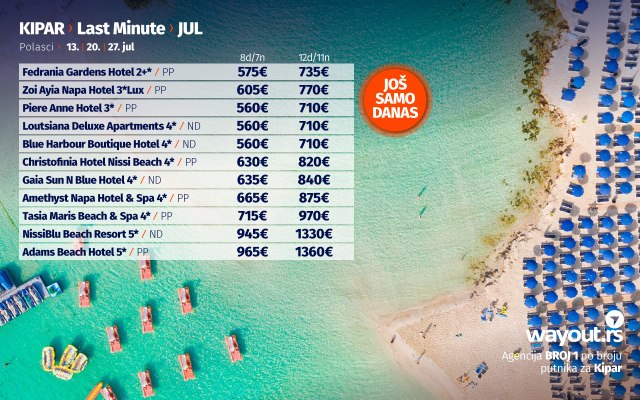 A ako ste navikli da svoje putovanje na Kipar koristite turističke online portale, nemojte da vam bude teško da proverite Wayout cene aranžmana, uverićete se da ne postoji povoljnija, a kvalitetnija ponuda na tržištu, a ukoliko nađete jeftiniji aranžman nego u našoj agenciji, vratićemo razliku.