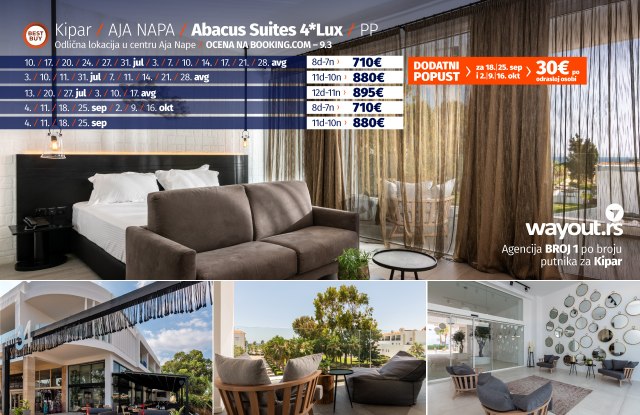 Abacus Suites, nalazi se na idealnoj lokaciji u letovalištu Aja Napa, samo nekoliko minuta udaljen od centra grada, u blizini svih glavnih sadržaja kao što su prodavnice, restorani i plaže. Hotel je otvoren 2018. godine i sadrži 36 raskošno dizajniranih apartmana, koji su svi opremljeni po odličnim standardima, a u k3ombinaciji sa opuštajućom atmosferom čine ga idealnim izborom za nezaboravno iskustvo odmora.
