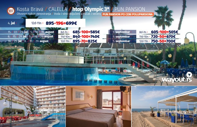 Ovaj hotel je udaljen 5 min hoda od plaže. Smešten na 300 metara od plaže Kalelja, objekat htop Olympic #htopEnjoy poseduje 3 otvorena bazena za odrasle i decu. Sve sobe imaju klima-uređaj, sopstveni balkon ili terasu i TV sa satelitskim kanalima.U hotelu H TOP Olympic se organizuje besplatan program aktivnosti za decu uzrasta do 12 godina, koji je na raspolaganju 6 dana u nedelji. Dostupni su bazen za malu decu i igralište.U restoranu sa uslugom na bazi švedskog stola služe se jela katalonske, španske i internacionalne kuhinje.U okviru objekta nalazi se i bar. Večernji zabavni program uključuje živu muziku i kabaretske predstave. Gostima je dostupna besplatna usluga prevoza do obližnjih hotela iz lanca H Top (hotel nudi uslugu samo u jeku sezone, za više informacija kontaktirate objekat). Hotel H TOP Olympic se nalazi u Kalelji, na Kosta del Marezme. Barselona se nalazi na nešto više od 40 km.