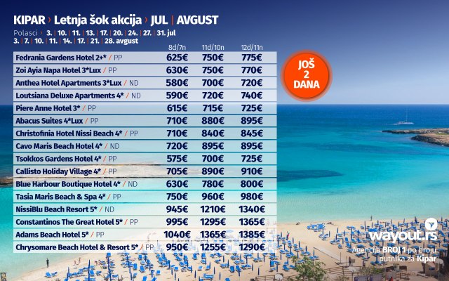 Ne propustite Letnju Šok akciju za jul i avgust, kao i za septembar i oktobar, koja se sastoji se od mešavine najtraženijih, najkvalitetnijih i najbolje ocenjenih hotela na Kipru, a sve to uz spektakularno povoljne cene, slobodno možemo reći i najpovoljnije do sad. Od hotela za ovaj period bismo izdvojili hotele u Aja Napi koji se nalaze na odličnim lokacijama blizu plaža i samog šetališta, a to su Pierre Anne Hotel i Tasia Maris Beach koji se nalazi uz obalu, i Fedrania Gardens, a svega nekoliko minuta hoda od samog centra Aja Nape, kao i Abacus Suites, luksuzni boutique hotel takođe nedaleko od plaže i centra svih zbivanja u Aja Napi. Svakako, ne smemo zaboraviti porodični hotel Callisto Holiday Village sa promocijom koja podrazumeva da dvoje dece do 14 godina ne plaćaju smeštaj kao i jedan od najluksuznijih hotela u Aja Napi Adams Beach, koji u Superior sobi može smestiti dvoje dece do 13 godina koja plaćaju samo avio kartu, kao i hotel Christofinia Hotel koji se nalazi svega 200 metara udaljen od Nissi plaže.