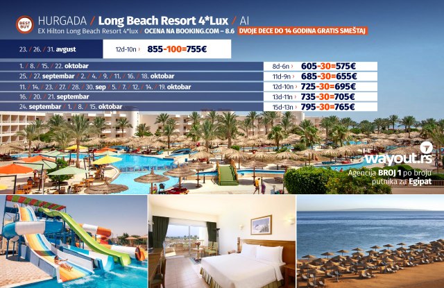 Naravno, period u julu i avgustu je najfrekventniji kada su u pitanju godišnji odmori, a za sve naše putnike, u saradnji sa najpopularnijim hotelima na našem tržištu, a definitivno je Hurgada porodično letovalište i kada se ceo trošak sabere, uzimajući u obzir nadaleko poznati All Inclusive koncept, ova destinacija je najisplativija, a Wayout agencija je ekskluzivno za svoje putnike obezbedila gratis smeštaj za dvoje dece do 14 godina u hotelima New Eagles Aqua Park, Long Beach Resort, Bella Vista, La Rosa Waves i Tia Makadi Heights.