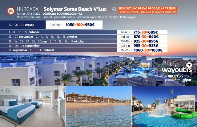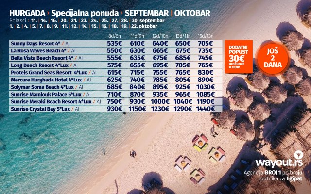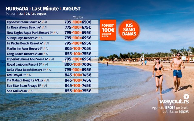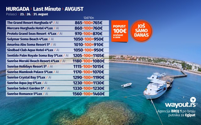 Kada je problem testova i uslova za ulazak u Egipat rešen, vreme je da bez stresa odaberete hotel po vašem ukusu i prepustite se planiranju svog dugo čekanog odmora. Za sve putnike koji žele da u julu provedu svoj odmor u Hurgadi, pripremili smo fantastičnu Last Minute akciju za polaske 23. / 26. / 31. avgusta. Naravno, kao što ste navikli od Wayout agencije, u ponudi se nalazi najveći izbor hotela za svačiji ukus i svačiji džep i uključuje veliki broj najpopularnijih i najkvalitetnijih hotela u Hurgadi. Naravno, sve to u kombinaciji sa najpovoljnijim cenama na tržištu, Wayout ponudu za Hurgadu čini najboljom na tržištu što potvrđuje zvanje turoperatora br. 1 po broju putnika za Hurgadu.