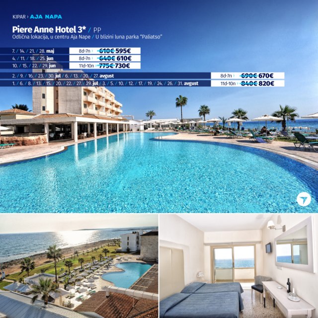 Hotel Piere Anne ima odličnu lokaciju na obali mora, na 5 minuta od centra Aja Nape i na 5 minuta od luke i plaže. Zabavni park Parko Paliatso Fun se takođe nalazi odmah iza hotela, zajedno sa čuvenom ulicom Nissi Avenue. U neposrednoj blizini nalaze se prodavnice, barovi i restorani, a svi sadržaji Aja Nape su na dohvat ruke. Hotel Piere Anne se sastoji od 3 bloka soba sa 2 velika otvorena bazena.Bazeni imaju direktan pristup stazi uz more, a bar pored bazena "En Plo" je odlično mesto za opuštanje tokom dana. Iako hotel nema mnogo sadržaja na licu mesta, Piere Anne je toliko blizu svega u Aja Napi da je odlična baza za zabavu na plaži ili provod u klubovima., kao i odmor uz Mediteran.