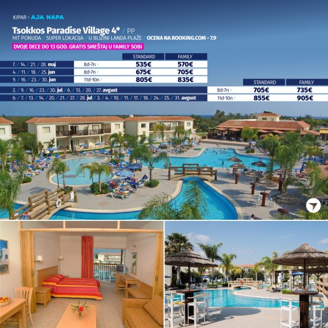 Ovo odmaralište sa 4 zvezdice nalazi se u letovalištu Aja Napa. Nudi zatvoreni bazen, fitnes centar, saunu i otvoreni bazen nepravilnog oblika, okružen nameštenom terasom za sunčanje. Sadržaji odmarališta Tsokkos Paradise takođe obuhvataju restoran-bar pored bazena, igraonicu sa bilijarom, teniski teren i mini-market. Smeštajne jedinice u odmaralištu Tsokkos Paradise imaju balkon sa pogledom na bazen. Pored kupatila sa fenom za kosu i besplatnim toaletnim priborom, svaka smeštajna jedinica sadrži dobro opremljenu čajnu kuhinju sa trpezarijskim stolom, pločama za kuvanje, frižiderom i električnim kuvalom. Na raspolaganju je i TV sa satelitskim kanalima. Gosti se mogu opustiti u ležaljkama pored bazena i uživati u osvežavajućim pićima iz snek bara. Za najmlađe goste obezbeđeno je dečje igralište. Odmaralište takođe raspolaže dečjim klubom, salonom i opremom za stoni tenis. Recepcija odmarališta Tsokkos Paradise radi 24 sata dnevno, a osoblje pruža usluge konsijerža i menjačnice. Posluga u sobi i lanč paketi takođe se mogu organizovati.