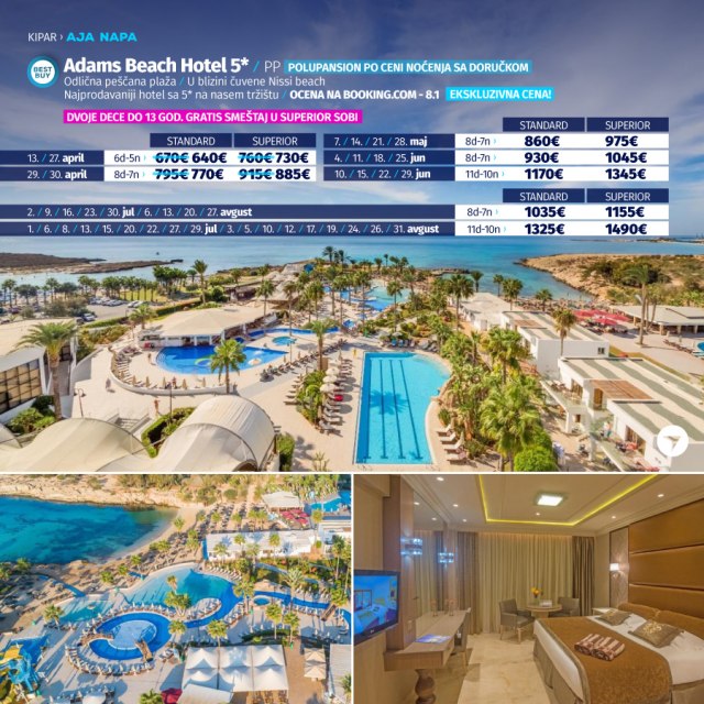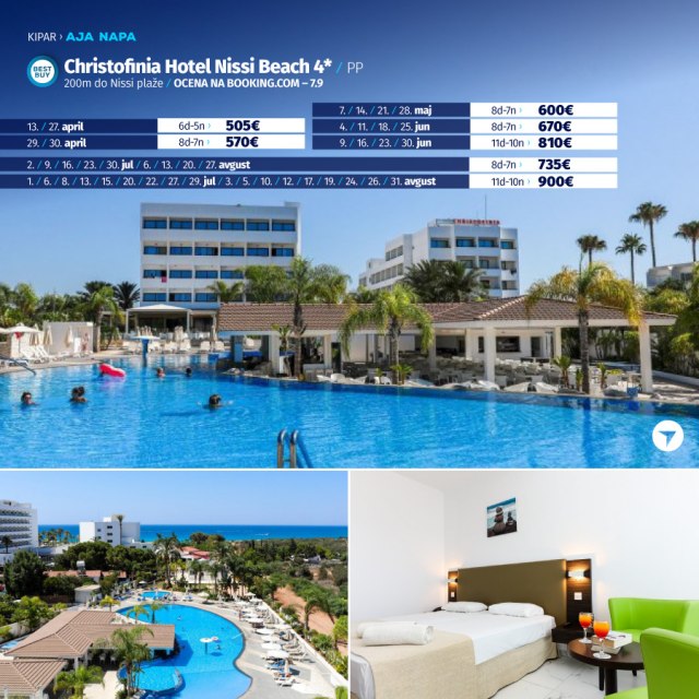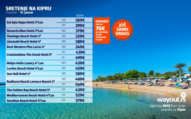 Definitivno nova omiljena letnja destinacija naših turista, svakako jeste rajsko ostrvo Kipar. Osetite čari Mediterana, fantastičnih plaža, veoma kvalitetnih hotela, izuzetne gastronomske ponude, kao i nezaboravnog noćnog provoda. Za naše putnike smo spremili odličnu first minute ponudu sa pažljivo izabranim hotelima, kako na osnovu pređašnjih iskustava naših klijenata, tako i na osnovu odličnih ocena na turističkim portalima.