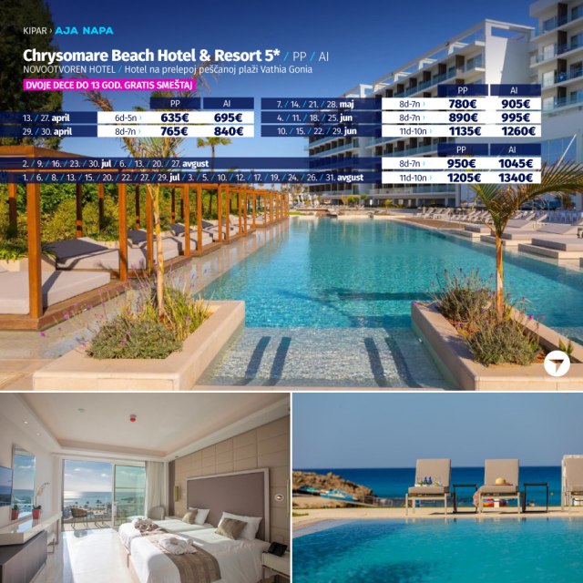 Od novosagrađenih hotela u Aja Napi (2019/2020 god.), Chrysomare Beach Hotel & Resort, s pravom se može svrstati među najluksuznije i najbolje pozicionirane hotele. Izgrađen je na početku jedne od najlepših peščanih uvala Vathia Gonia, na samo kilometar od centra grada. Hotel ima brojne sadržaje: glavni restoran u kome se služe specijaliteti lokalne i internacionalne kuhinje, italijanski restoran, grčku tavernu, azijski restoran, pet barova, nekoliko bazena (unutrašnji bazen, veliki spoljašnji bazen sa toboganima, dečiji bazen...), luksuzni Spa centar sa masažama, đakuzijem, pedikir/manikir salonom, frizerskim salonom i velikom teretanom. Celodnevna zabava je organizovana za sve uzraste (mini klub, program za tinejdžere, animacija za odrasle) i završava se u kasnim večernjim časovima folklornim nastupima, muzičkim predstavama ili plesom. Sve sobe su klimatizovane, imaju balkon ili terasu, SAT TV, telefon sa direktnom linijom, ketler, sef, mini frižider, fen i toaletni pribor. Bežični internet je dostupan u svim delovima hotela.
