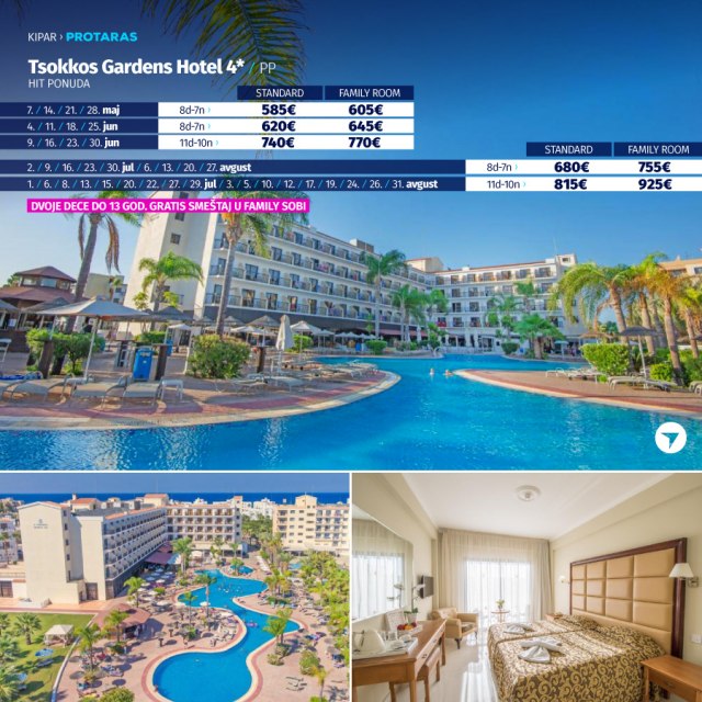 Ovaj objekat je udaljen 10 min hoda od plaže. Smešten u Protarasu, objekat Tsokkos Gardens Hotel nudi otvoreni bazen sa zasebnim delom za decu i terasu za sunčanje sa nameštajem na otvorenom. Hotel je udaljen 800 metara od plaže Sanrajz (Sunrise). Plaža Kalamies udaljena je 2,5 km, a plaža Konos 3,8 km. Sve klimatizovane sobe imaju telefon, balkon i TV sa satelitskim kanalima. Do soba se dolazi liftom. Kupatilo je opremljeno fenom za kosu i tušem. Hotel Tsokkos Gardens ima bar i à-la-carte restoran koji, takođe, sprema specijalne menije za decu. Gosti svakog jutra mogu da uživaju u doručku. Objekat ima recepciju koja radi non-stop. Usluga čuvanja dece je dostupna na zahtev. Tretmani masažom mogu da se organizuju. Na raspolaganju su teniski teren, sauna, hamam i hidromasažna kada. Javni parking na licu mesta može besplatno da se koristi.