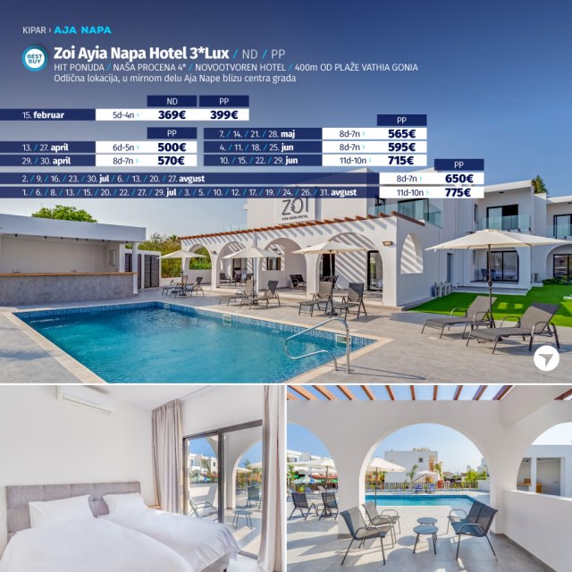 Predstavljamo vam hotel koji sredinom juna otvara svoja vrata za goste. U pitanju je potpuno nov hotel na odlicnoj lokaciji. Nalazi se u Aja Napi, na 15 minuta setnje od centra ovog mesta i u blizini plaze Vathia Gonia. U blizini hotela nalazi se brojni restorani, barovi i stanica gradskog prevoza. Hotel poseduje WiFi, bar kod recepcije, spoljasnji bazen i teretanu. Sobe su moderno opremljene, sa AC uredjajem.