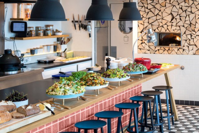 Bassena kuhinja (zajednički sto sa barom i kulinarskom poudom tokom celog dana), zimski vrt i terasa.