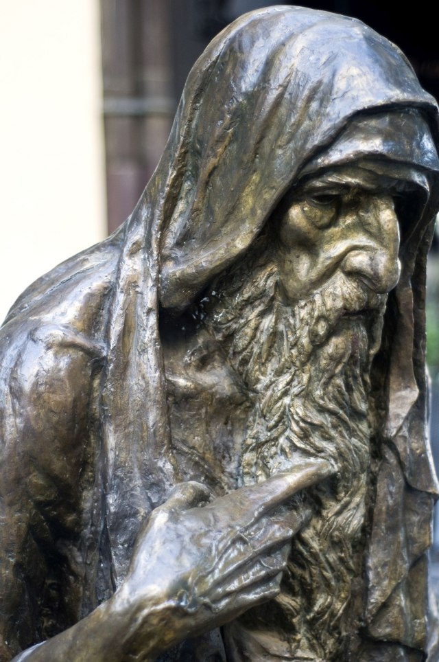Pretpostavlja se da statua predstavlja Isusa Hrista kao prosjaka. Statuu je izradila Nataša Bozarovska i to je jedna od prvih postavljenih u sklopu preobražaja grada.