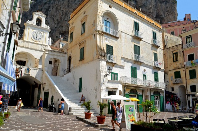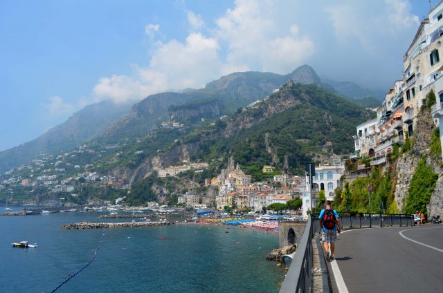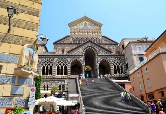 Iz Atranija, duž magistrale krenuli smo put, deset minuta pešice udaljenog, turistički izuzetno posećenog Amalfija (Amalfi), po kojem je čitava nevelika južna obala Sorentinskog poluostva dobila naziv. U ovom gradiću, na glavnom trgu obišli smo predivnu Katedralu Svetog Andreje (Duomo di Amalfi - Cattedrale di Sant’Andrea) sa bazilikom iz IX veka (Basilica del Crocifisso), sazidanom u romaničkom stilu sa veoma jakim uticajem arapske i normanske arhitekture (Arapi i Normani, između ostalih su vladali Napolitanskim kraljevstvom). Ceo kompleks smešten je na vrhu velikog stepeništa.
