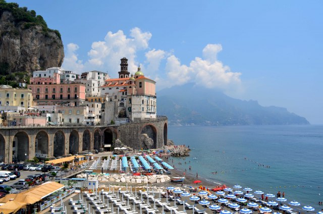 Sa severne strane Sorentinskog poluostrva nalazi se čuveni gradić Sorento (Sorrento), smešten na litici, na južnoj obali Napuljskog zaliva, dok se sa južne strane, jedno do drugog, nižu mestašca čuvene Obale Amalfi. Na početku našeg jednodnevnog izleta iz Napulja, prošetali smo prelepim, malenim i izuzetno simpatičnim, turistički slabije posećenim Atranijem (Atrani) i na glavnom trgu posetili crkvu, probali napolitansku picu i sladoled. Među turistima, Atrani je poznat po uređenoj plaži sa ležaljkama i suncobranima, na kojoj je gužva značajno manja od one u susednom Amalfiju. Lični utisak koji je ostao, govori u prilog tome, da Atrani nije ništa manje zanimljiv od Amalfija, očigledno bez dovoljno dobre reklame.