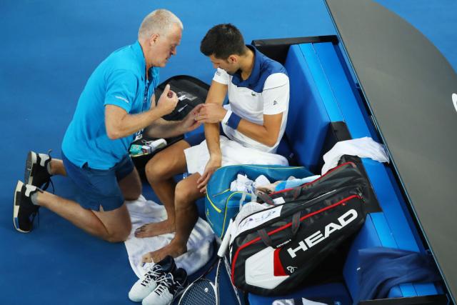 Đoković je između dva seta zatražio medicinski tajm-aut. Ima problema sa žuljevima, ali i sa laktom zbog koga je pauzirao u prethodnih šest meseci. Posle nekoliko minuta masaže nastavio je meč.