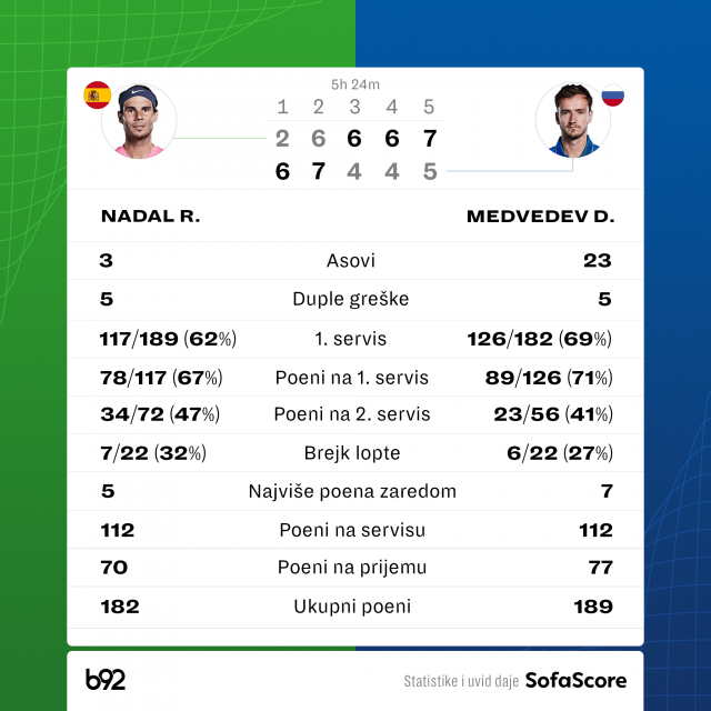 Ipak, drama se nastavila, a Nadal je u 11. gemu sačekao grešku Medvedeva iz forhenda na brejk lopti, a onda u narednom bio sigurniji i na kraju slavio.