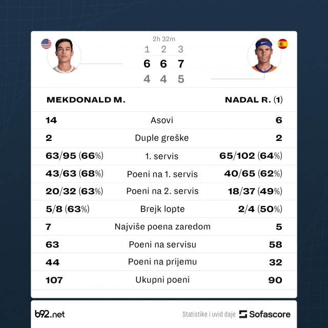 Nadal je vratio brejk smanjio na 4:2, ali Mekdonald nije sebi dozvolio da izgubi stečenu prednost.