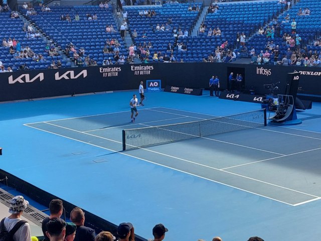 Glavni stadion u Melburnu je prazan, pošto je Aleks de Minor brzo završio meč sa Benamenom Bonzijem i upravo će Australijanac igrati protiv boljeg iz duela srpskog i bugarskog igrača.