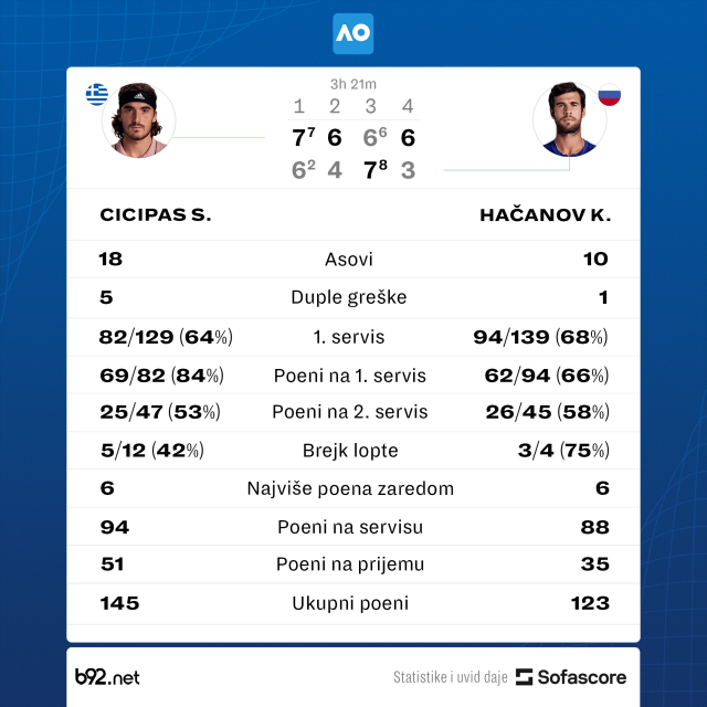 Stefanos Cicipas pobedom protiv Karena Hačanova 7:6 (2), 6:4, 6:7 (6), 6:3, plasirao se u finale Australijan opena.
