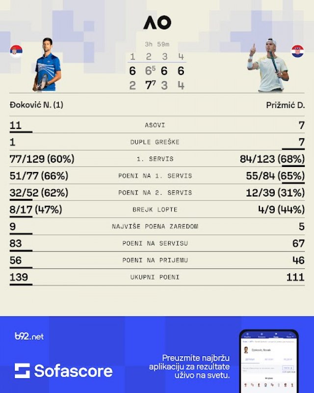 Đoković je bio veoma bled, servirao je prilično slabo, posebno na prvi servis, dok je Hrvat igrao nadahnuto i bez respekta prema najvećem svih vremena. Prižmić je došao do četiri vezane set lopte, Novak je spasao tri, ali četvrtu nije mogao i rezultat je tako bio poravnat.